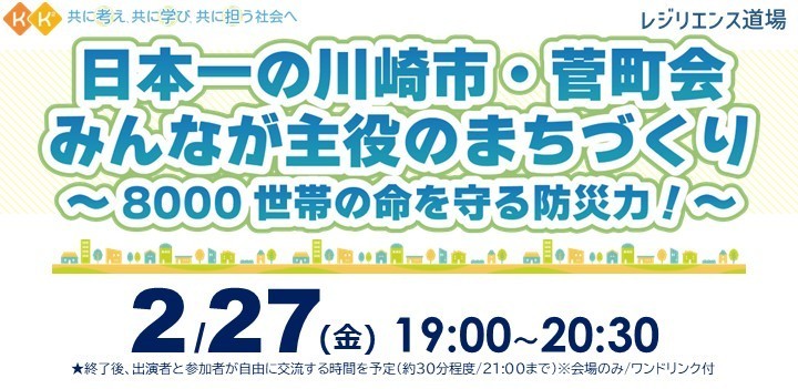 トークライブ開催 日本一の巨大町内会の防災力に学ぶ 「日本一の川崎市・菅町会、 みんなが主役のまちづくり ~8000世帯の命を守る防災力!~」
